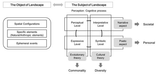In this study, conceptual framework is presented to understand commonality and diversity of perception. First, the objects of landscape are divided into spatial configurations and specific elements as well as ephemeral events. Ephemeral events are the effects of time constraints such as weather, sunlight, color, and seasons [23,25]. These events also improves extraordinary experience of landscape [19]. Then, the perception of landscape was divided into four levels of cognitive process. The perceptual and expressive level of the cognitive process emphasize the commonality of landscape perception based on evolutionary theory, and the interpretational and symbolic level can grasp the diversity of perception based on the cultural theory (see Figure 1).