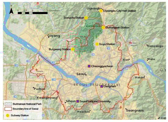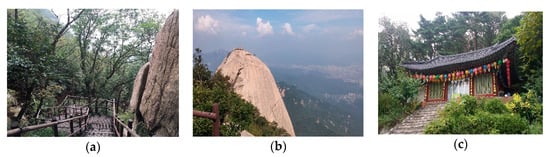 Bukhansan National Park is a Category V Protected Landscape/Seascape according to the classification system of the International Union for the Conservation of Nature (IUCN). It is the 15th national park designated in South Korea (5 April 1983), and covers an area of 78.5 km2, including Mt. Bukhansan and Dobongsan, and the highest peak Baekundae (837 m elevation) [33]. The park is adjacent to Seoul Metropolitan City, and is the most visited national park in South Korea, currently attracting approximately 10 million tourists annually (one-fifth of the total South Korean population) [34] (see Figure 2).