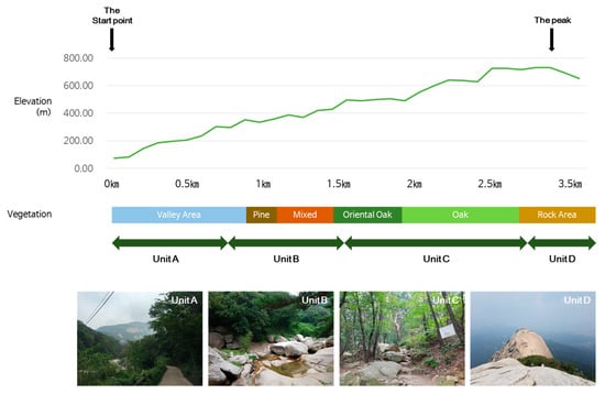 The concept map of elevation, gradient, vegetation, and representative landscape photos of each unit of the trail.