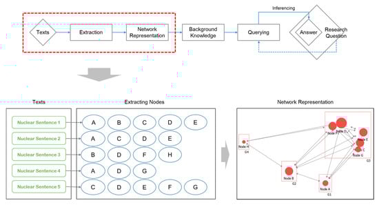 The core concept for understanding the relationship between nodes is “proximity”, which indicates how close the relationships are between the nodes. In SNA, this concept is expressed as a “co-occurrence” of the nodes [49,50]. It is assumed that nodes within a certain range of text are semantically correlated between all nodes within that range when they occur at the same time [50]. In general, co-occurrence is expressed by the frequency of co-appearance of the nodes in a single nuclear sentence. However, a researcher may limit the scope of the co-occurrence to the nature of the text and the research purpose [48] (see Figure 4).