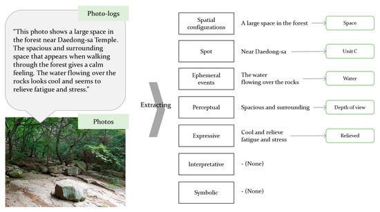 We set up the analysis unit (node) to perform the SNA. The size of the nodes was limited to words and phrases. The content of each picture was considered as a range of co-occurrence frequency. We used an “exploratory approach” to extract nodes: nodes that include the object of landscape, spot (the location where the photograph was taken), ephemeral events, and the level of cognitive processes (perceptual, expressive, interpretative, and symbolic) were selectively extracted (see Figure 5).