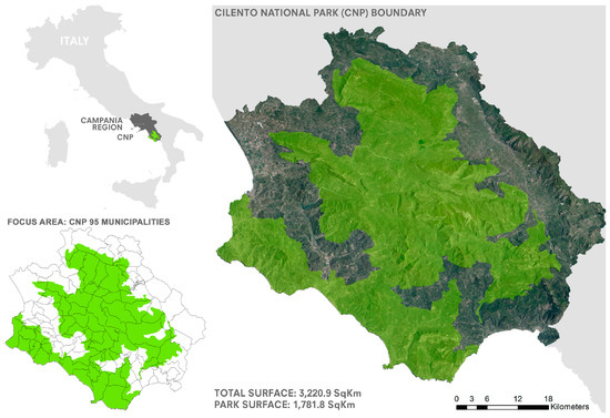 51]. The Italian regulation sets three levels of territorial units for governance, which correspond to the States (NUTS1), the Region (NUTS2) and the Municipalities (NUTS3). The focus area of the case study is located in the Campania Region (Italy) (NUTS 2) and includes 95 municipalities around the National Park of Cilento, Vallo di Diano and Alburni (CNP) in Salerno Province (NUTS 3). The focus area covers approximately 3220.9 Km