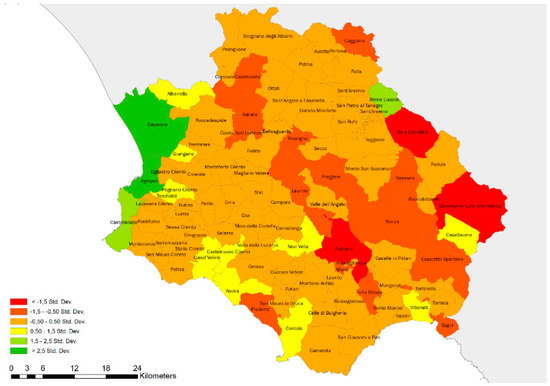 57], the percentage of farmland, and the density of the local products firms. The map shows a scattered distribution of these services, with high values for the west coastal zones and internal areas, within which agriculture and production are most developed (