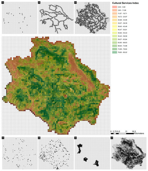 The Cultural Services (CS) focus on the intangible values that people obtain from the landscape. The problem of evaluating this class of values was generalised by using proxy-criteria that represent physical landscape elements expressing aesthetic, recreational, spiritual, social and informative values linked to the human–natural ecosystems. The landscape metric (LM) depicting the CS is the density metric, as it offers the opportunity to detect clusters of services in the territory.