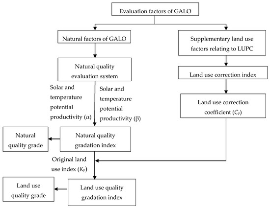 The land-evaluation analysis concentrates on different purposes that can be grouped into two main classes, land vulnerability or degradation approaches and namely land suitability or productivity [17]. The gradation of agricultural land quality (GALQ) framework proposed by the Ministry of Land and Resources of China is the theoretical basis of this paper, which aims to assess land suitability or productivity. The calculation of natural quality grade is consistent with the GALQ method within the study area. In addition, the natural quality factors and their weights, as well as the solar and temperature potential productivity (α) and the yield ratio (β), are kept unchanged. Thus, the land use and production conditions (LUPCs), which have a significant impact on the CLQ, are added [30]. In the process of evaluation, the land use coefficient is generally assessed as a constant value [30]. Using the concept of coefficient correction, we include the LUPCs (P) in the calculation of the land use correction index Kp and reassess the grade of the CLQ (Figure 1). P can be converted to the land use correction coefficient using data obtained 2009 and 2014 and the corresponding annual scores. In the future, when more data are available, it will be better to use data that cover a longer time period to calculate the coefficient.