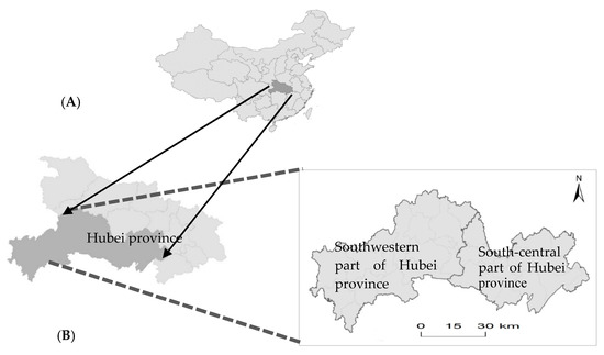 General situation of the study area: (A) the location of Hubei Province in China; and (B) area map of the south-central plain division and southwest mountainous division.