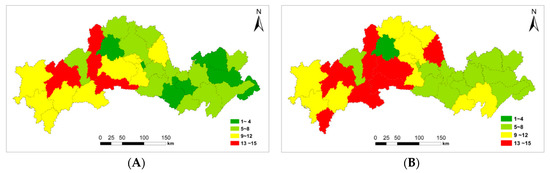 According to the GALQ results for China issued by the Ministry of Land and Resources in December 2009, the agricultural land within China was divided into 15 categories (primarily categories 7–13).The mean classification calculated using area weighted averaging (CC-AWA) was 9.8 [44]. Assessment of the study area showed that the grades of CLQ present within the study area in 2014 were 5–9 and the CC-AWA was 7.6, which indicates that the overall level of CLQ in the study area was moderate and slightly higher than the national average. Among the 34 counties of the SCPDHP and the SWMDHP, the counties with the three best overall optimal average classifications are Zigui and Xiaoting within the SWMDHP and Gongan within the SCPDHP, which have values of 2.9, 4.1 and 4.5, respectively. The three counties with the worst average classification values areLaifeng, Enshi and Badong within the SWMDHP, which have values of 12.6, 13 and 13.1, respectively. Excellent and high-quality UCL occurs primarily within the SCPDHP. The lower part is mainly distributed within the SWMDHP (Figure 6).