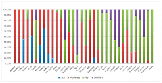 The quality of cultivated land can be divided into four classes, based on their gradation: excellent (1–4), high (5–8), moderate (9–12) and low (13–15) [44]. The area covered by cultivated land with the excellent grade is 968.0 kha, which accounts for 14.9% of the total area; the high grade is inferred for 3589.5 kha, which accounts for 55.3% of the total area; and the areas of the moderate and low grades are 1648.8 kha and 285.0 kha, and these grades account for 25.4% and 4.4% of the total area, respectively. The statistics of the four classes of cultivated land at the County level (Figure 7 and Figure 8, and Table 3) reveal that the structure of the gradation differs among the counties within the study area.