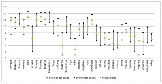 The distribution of the different grades of cultivated land across counties and within individual counties is complex (Figure 9). First, the degree of concentration of cultivated land differs among the counties, which is reflected in the difference between the best and worst monitoring units found in each of the counties. For example, in the counties of the SWMDHP, such as Jianshi and Xiaoting, and in the counties of the SCPDHP, such as Qianjiang and Xiantao, the gap between the highest and the lowest monitoring units is more than seven on average, compared to less than three for Badong County in the SWMDHP and Shishou City and Jiayu County in the SCPDHP. For the SCPDHP, the gap between the highest and the lowest monitoring units is slightly larger than that of the SWMDHP, and these gaps are 4.9 and 4.5, respectively. Second, the deviation of the average quality grade between the counties and the study area is quite different. For instance, counties such as Laifeng, Enshi, and Badong in the SWMDHP are five grades lower than the average level for the study area (AL-SA). In contrast, Gongan County in the SCPDHP is three grades higher than the AL-SA. Generally, the CLQ in the SCPDHP is better than that of the regional average, whereas those in the SWMDHP are lower than the regional average. Third, the deviation of the average grade of the counties is different from that within the counties. For example, the average grade is one higher than the mean grade for Tianmen City, while the average grade is 0.3–0.5 lower than the mean grade for Zhijiang City and Gongan County. This result shows that greater deviations between the average and mean grades were noted in the SCPDHP, and the width of the distribution in the SCPDHP is greater than that in the SWMDHP. This variability could be owing to spatial differences in the natural processes that have shaped the landscape, as well as land management practices [4].