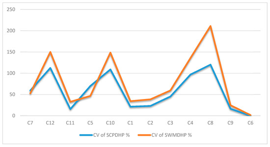 Comparison of the CV of the land use factors between the SCPDHP and the SWMDHP in 2014.