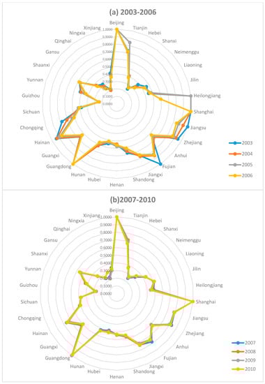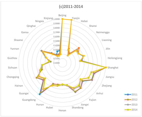 Provincial total factor efficiency of water resource in China, 2003–2014: (a) 2003–2006; (b) 2007–2010; and (c) 2011–2014.