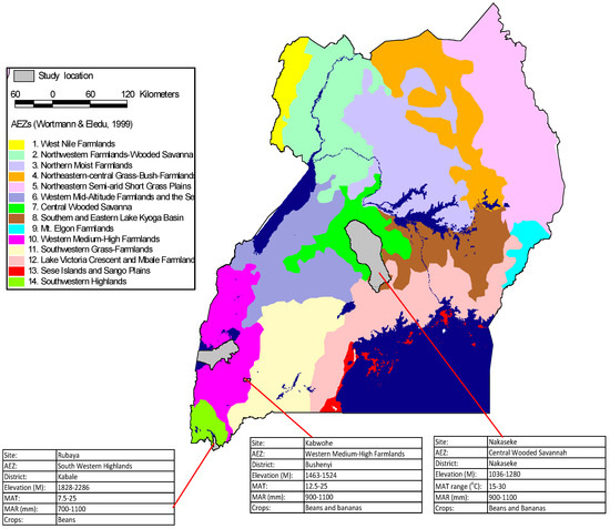 The study was conducted in three sites with different tribes and climatic conditions: Nakaseke, Kabwohe and Rubaya (Figure 1 below). Nakaseke is located in central Uganda and is dominated by the Baganda tribe in the coffee-banana farming system. This site is in the Central Wooded Savannah agro-ecological zone with an altitudinal range of 1086–1280 masl, with an average rainfall of up to 1100 mm and temperature ranging between 16 and 30 Celsius. The soils in Nakaseke are sandy clay loam with low to medium productivity. Kabwohe is situated in western Uganda and is dominated by the Banyankole tribe, in a predominantly banana-cattle farming system. It is within the western medium–high farmlands agro-ecological zone with an altitude of 1400–1500 masl, and rainfall of up to 1100 mm. The soils in Kabwohe are sandy clay loams with alluvial parent rock of medium to high productivity. The average annual temperature in this site is between 12 and 28 degrees Celsius. Rubaya site is located in the south-western highlands of Uganda, with an altitude ranging between 1800–2200 masl, rainfall up to 1100 mm, and average annual temperatures between 11 and 25 Celsius. Rubaya is dominated by the Bakiga ethnic group and has volcanic soils with medium to high productivity. The common bean assessment was done in the three sites, while the banana assessment was only done in Nakaseke and Kabwohe sites because it is not an important crop in Rubaya. These sites were purposefully selected because farmers here grow banana and/or common bean and there were high levels of diversity in the two crops.