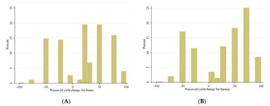 Unconditional frequency distribution of perceived yield change (%) for beans (A) and banana (B).