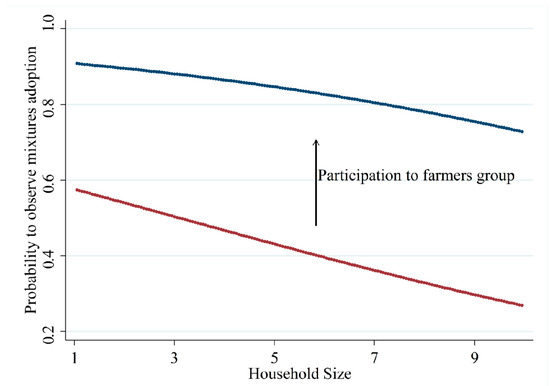The estimated effect of “household size” and “participation in a farmers group” on the probability to observe mixtures adoption of farmers.