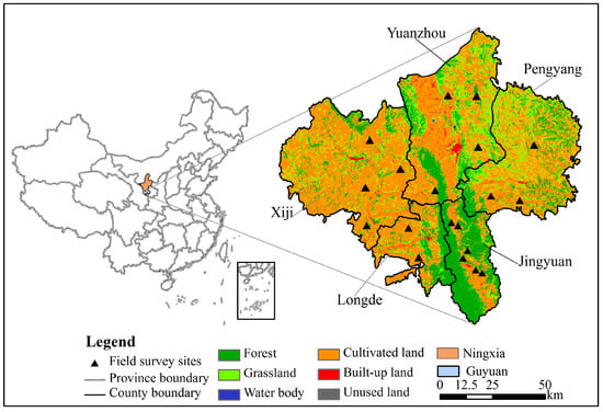 The location of Guyuan in China, locations of the survey sites, and land-use map in 2013.