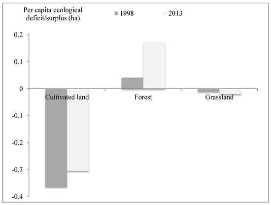 Table 3 shows that per capita BC increased from 0.6101 ha in 1998 to 0.6197 ha in 2013, possibly because the increase to nearly 4 times the 1998 level for the BC of forest was offset by a decrease of roughly 24.1% in cultivated land. The net result of the changes in EF and BC is that the per capita ecological deficit (BC – EF) decreased from 0.3878 ha in 1998 to 0.1514 ha in 2013. These results confirm that the Grain for Green program has increased the study area’s BC, as has been the case elsewhere in China [], but reveals that there is still a significant ecological deficit. When the per capita deficit is multiplied by the total population of Guyuan, the total EF of biological resources in 2013 equaled 956,164 ha, versus a total BC of 768,428 ha; thus, the total deficit of biological resources is 188,356 ha, which is equivalent to 16.6% of the total area of 1.13 × 106 ha. However, this deficit is only for the biological resources of Guyuan, and further work will be required to quantify the effects of all consumer goods, fuels, and greenhouse effect gases.