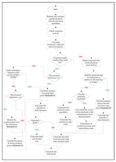 The products with 0 shelf-life and the unsold ones are defined as stale products and they are removed from shelves. For this reason, different stocks of products are sometimes displayed on shelves simultaneously, and same group stocks of a product with the same shelf life are sometimes displayed on shelves together, as well. The work flow of different scenario based models is shown in detail in Figure 2. The system of the proposed model continues to work until the end of the market decision period. In addition, the limits of each product freshness rates, such as x and y, are determined by the supermarket’s top managers depending on the products sales rate. Thus, every product life cycle sustainability and customer attitudes change in different scenarios.