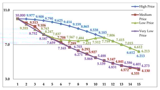 However, the products chosen by customers have three different stock types: seven demanded for first group; six demanded for second; and 10 for third group of the product. The first product is selected as an example to show that how the price is changing from the initial price to the end. It is clearly seen in Figure 3 that high pricing strategy and low one follow a similar path after the freshness rate of 0.33 (after 11th day of its shelf-life). Thus, when the staleness rate is getting higher, the pricing strategies are working in the same way. In addition, the medium pricing strategy and very low (deep) one reach the same price at the end of life cycle of the product. All other products, 2–4, have the similar solutions as the first product. All other product prices have the same way trend, as seen in Figure 3 and Table 8, Table 9 and Table 10.