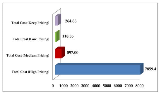 Furthermore, the differences between the common and the proposed systems for supermarkets are compared with each other. It is clearly determined in this paper that total profit of scenario 3 (low pricing strategy) is increased, while the total cost is decreased approximately 98.5% in the long term, as clearly seen in Figure 5. However, more than 15% improvement is achieved for total profit via scenario 3. Moreover, numerical simulation results are defined with figures to show the effects of the proposed system in detail. It is clearly seen that although very low-price strategy is the most preferable strategy for the customers, it is not so useful for the supermarkets (because of profit balance). Therefore, low price based scenario is more profitable for both sustainable nature balance and sales sustainability in real life.