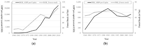 Regardless of these challenges, evidence for correlated ecosystem restoration and economic growth is exemplified in some regions, such as the Korean Peninsula. Based on forest restoration history, the Republic of Korea (South Korea) and the Democratic People’s Republic of Korea (North Korea) had different political, economic and environmental pathways. Notably, serious environmental degradation has been reported since the 1990s in North Korea, which resulted in forest degradation and decreasing net primary productions [,,]. In contrast, forest stock in South Korea has increased since the 1970s with proper forest management and restoration activities []. A quantitative comparison of the two countries based on gross domestic product (GDP) per capita data from the World Bank and forest stock data from 1960–2010 provided by the Korea National Institute of Forest Science (NIFoS) is shown in Figure 1 [,].