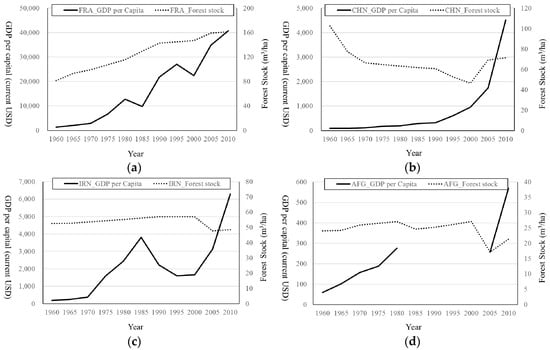 Relationship between GDP per capita and forest stock in the Mid-Latitude region: (a) France; (b) China; (c) Iran; and (d) Afghanistan.