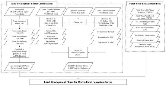 To implement appropriate land management strategies, it is essential to identify past and current land cover and land use conditions. In addition, an assessment of land development phases (LDPs) in a human-dominated landscape coupled with an analysis of the water-food-ecosystem (WFE) nexus can deepen our understanding of sustainable land management. In this study, we proposed the concept of land development phases (LDPs) by forest and GDP changes using previously-applied theoretical and empirical approaches. The positive relationship between GDP growth and forest stock changes was used to analyze the timing of forest stock changes as five-year averages, which were aggregated over 20 years to classify LDPs. In addition, forest area changes compared with GDP and GDP per capita changes were analyzed to identify LDPs. Based on two conceptual approaches, we suggested global land into three LDPs: degradation, restoration and sustainability. Using this approach, most of Europe, North America and northeast Asia were classified as sustainability phases, while Africa and Central Asia in the Mid-Latitude region appeared to have degradation or restoration phases. The LDPs described could be improved with further incorporation of solid data analysis and clear standards, but even at this stage, these LDP classifications suggest points for implementing appropriate land management. In addition, indices from comparative analysis of the LDPs with the WFE nexus can be connected with socio-economic global indices, such as the Global Hunger Index, the Food Production Index and the Climate Change Performance Index. The LDPs have the potential to facilitate appropriate land management strategies through integrating WFE nexus and ecosystem services; we propose future research that uses this integration for the Mid-Latitude region and worldwide.
