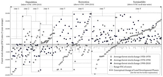 Based on forest stock changes and adopting FT theory, land sustainability status can be classified into three phases: early transition as a degradation phase, late transition as a restoration phase and post-restoration as a sustainability phase. In FT theory, forest variables and attributes, such as forest area, forest stock, forest biomass and forest carbon, are suggested variables. However, quality also needs to be accounted for; for example, forest area represents the quantitative amount of forest, but not the quality of the forest in such an area []. Therefore, we adopted forest stock as the classification variable, as it incorporates both quality and quantity. The average of five-year forest stock changes was calculated and aggregated into 20-year intervals, 1950–1970, 1970–1990 and 1990–2010. Forest degradation was defined as an aggregated average value in the time series of below zero (negative), decreasing forest stock. Forest restoration and sustainable management were defined by stock values above zero (positive). The analysis also considered changes through time: trends from negative to positive were regarded as restoration or reaching a sustainability phase and good management, while declining trends were regarded as approaching a degradation phase. This approach is also an attempt to reflect current forest management activities to mitigate climate change through increasing forest stock for carbon sequestration and adaptation based on Reducing Emission from Deforestation and forest Degradation (REDD+) activities in developing countries []. In addition, it could represent sustainable forest management schemes in certified forests []. After synthesizing the data and evaluating the trends over the three 20-year periods, we divided the countries into eight zones (Figure 4).