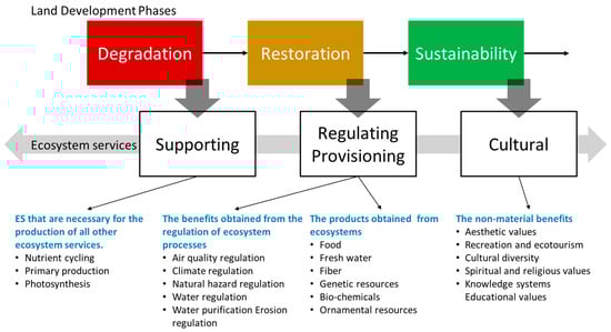 Ecosystem services based on the LDPs can be implemented for sustainable management. The benefit of ecosystem services using the LDPs approach is that they can suggest management solutions that achieve environmental sustainability. In reviewing some past and current major environmental challenges worldwide and in the Mid-Latitude region, grouping land covers based on LDPs provides an environmental rationale for research. Focusing on the problem area will provide better understanding of the function and interaction of ecosystems from various perspectives. This type of approach can be used to address global climate change and move towards sustainable management of natural resources. Therefore, it is critical that ecosystem services be managed by the classified LDPs [,,] (Figure 7).
