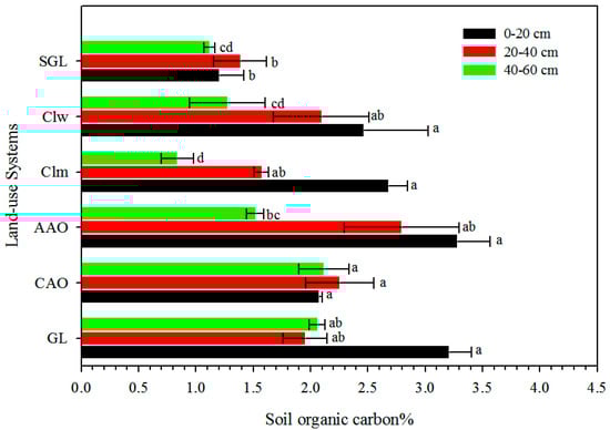 Soil organic carbon (SOC) under different land-use systems, the mean value results are not significantly different (p < 0.05), under different land uses of GL, CAO, AAO, Clm, Clw, and SGL. Different lowercase letters (a, b, c, d) indicate significant differences at p < 0.05.