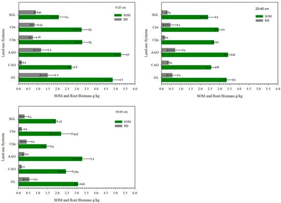 Percentage of soil organic matter (SOM) and root biomass (RB) in different soil layers, mean value with a standard error, the results are not significantly different (p < 0.05), under different land uses of GL, CAO, AAO, Clm, Clw, and SGL. Different lowercase letters (a, b, c, d) indicate significant differences at p < 0.05.