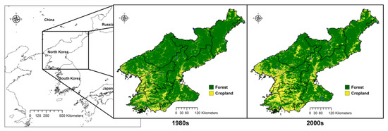 Deforestation in North Korea is garnering attention as being representative of the environmental change occurring in the Korean Peninsula and is causing concern at the international level [1]. Deforestation in North Korea has environmentally negative impacts similar to the cases of expansion of areas subject to desertification or reduction of water in the Aral Sea. Recently, the issue of deforestation has brought into focus the decrease in carbon sinks, which is symptomatic of a system affected by climate change [2,3,4].
