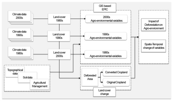 Previous research related to soil degradation, cropland organic matter, and agro-hydrological cycles using EPIC-, RUSLE-, and GLEAMS-based agro-environmental variables has produced numerous cases for various time periods [39,40,41,42,43]. Figure 2 is a schematic representation of the research methodology, which allows a clearer understanding of the research process.