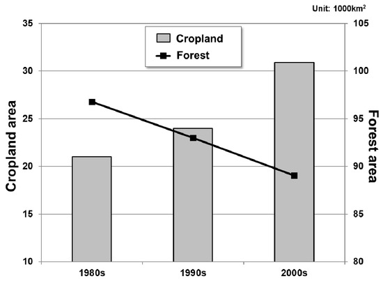 Ultimately, croplands were found to increase by 31% overall, showing a 12% increase between the 1980s and the 1990s and another 19% increase between the 1990s and the 2000s. In terms of the area by land-cover category (during the study interval), forest areas decreased by 7696 km2 and cropland areas increased by 9661 km2 (Figure 3). With regard to the areas of the land cover categories into which forests were converted, cropland was found to be the most extensive (~5800 km2), followed by grassland (~1400 km2). This means that 75% of the converted forest area was used for croplands, proving that croplands expanded considerably during the past 30 years of deforestation (Table 1).