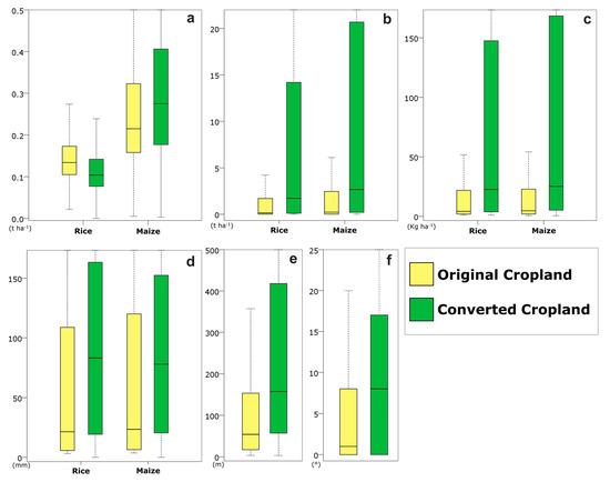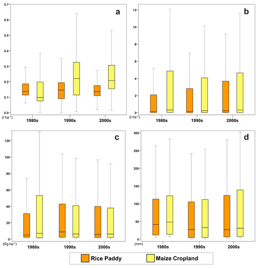 Water erosion largely increased in converted croplands, although the difference between the crops was not significant. The average water erosion amount of original cropland was 4.03 t ha−1 (rice paddies) and 4.72 t ha−1 (maize cropland). The water erosion of converted cropland was 9.3 t ha−1 (rice paddies) and 10.94 t ha−1 (maize cropland), more than twice the values of original cropland. The value of water erosion was higher in maize croplands and the difference was greater in converted croplands (Figure 7 and Figure 8). Furthermore, the deviation was also higher in maize croplands and largely increased in converted croplands.