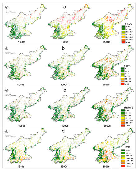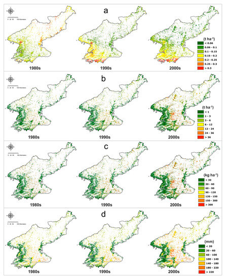 To verify the soil erosion value, existing research was reviewed. Meusburger et al. [53] estimated the soil erosion in the northern part of South Korea, adjacent to North Korea, using the 137CS method and the RUSLE. The soil erosion values of 0.9–7 t ha−1 year−1 were calculated by the 137CS method and of 0.02–5.1 t ha−1 year−1 were calculated by the RUSLE. Woo [62] estimated soil erosion of South Korea by field experiments and obtained values of 0.3–3.4 t ha−1 year−1. In this research, average estimated soil erosion of rice paddies for 30 years was 4.67 t ha−1 year−1 and that of maize croplands was 6.15 t ha−1 year−1. Considering the more complex topographical features and time series changes of land cover in North Korea compared to South Korea, the results of this research are reasonable in comparison to previous studies. Given the expectation of an increase in soil erosion caused by deforestation in North Korea, a slight overestimation is rational. Fu et al. [52] estimated that the soil erosion of agricultural fields in Washington, United States was 11.09 t ha−1 year−1. Turnage et al. [63] estimated the soil erosion of East Tennessee croplands at 2.6 t ha−1 year−1 using the RUSLE. The estimated soil erosion values in this study sound reasonable relative to other regions. Although the soil erosion amount was not directly comparable or verifiable for North Korea, the reliability of the results presented in this study was evaluated by comparing them with the findings of studies in South Korea (a neighboring country) and the United States, where the RUSLE was developed.