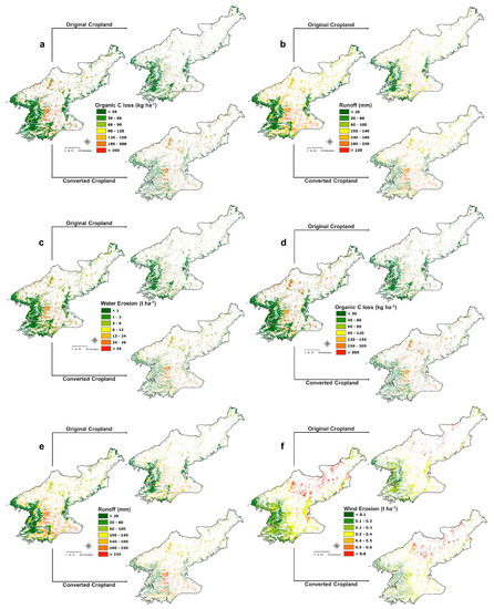 Spatial extraction with original croplands and converted croplands using the main variables: (a) Organic carbon loss of rice paddies; (b) Runoff of rice paddies; (c) Water erosion of rice paddies; (d) Organic carbon loss of maize croplands; (e) Runoff of maize croplands; and (f) Wind erosion of maize croplands.