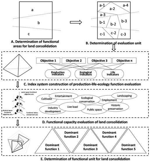 This study clarified the definition of FULC and established the demarcation method of FULC. First, production-life-ecology function-oriented land consolidation function areas and evaluation units were divided. Then, the functional capacity of each unit was calculated based on the established index system for unit demarcation. After drawing a rose diagram, the leading function of each unit in terms of land consolidation was selected. The demarcation framework of FULC can also be considered a process of transformation from a macro production-life-ecology function, which is based on planning objectives and social and economic demand, among others, to micro land consolidation functions, which are implemented to achieve differentiated optimization for sustainable land use. Given that the demarcation framework of FULC already considers the geographical units, natural resource distribution, land consolidation potential, regional spatial structure, and internal mechanism of regional social and economic development, the implementation of FULC can effectively identify the dominant function of land consolidation in the regional space and decompose the regional development strategy. Through a well-organized land consolidation project arrangement, the implementation of FULC can optimize the land utilization structure and spatial layout at the macroscopic level, thereby resulting in the overall improvement of the production-life-ecology function coordination in a productive cycle.