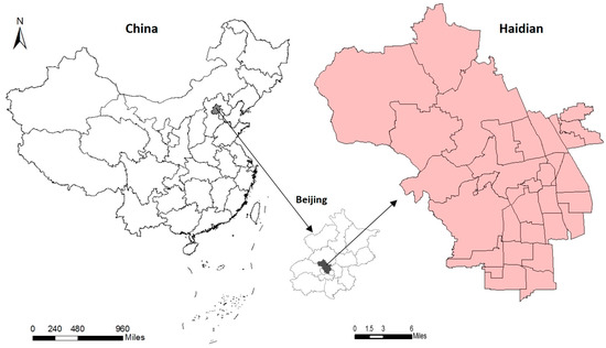 Haidian District is located northwest of Beijing and is an important area for the core functions of the capital, with a total of 22 subdistricts and 7 towns under its jurisdiction (as shown in Figure 4). As a technology innovation center with global influence, Haidian District is a historical and cultural area that reflects the national image and style and is a harmonious ecological civilization area in Beijing. Moreover, Haidian District is a pilot area for innovative land consolidation planning implementation mechanisms that are approved by the Ministry of Land and Resources at the county level for the first time as a good basis of land consolidation. With a total area of 430.8 km2, the district accounts for 2.6% of the total area of Beijing. The south area of Haidian District is urban area while the north area is rural area. In addition, its terrain is high in the east while low in the west. The plain areas in the east and south account for approximately 85% of the total area, with 91.20% of the population concentrated in this region.