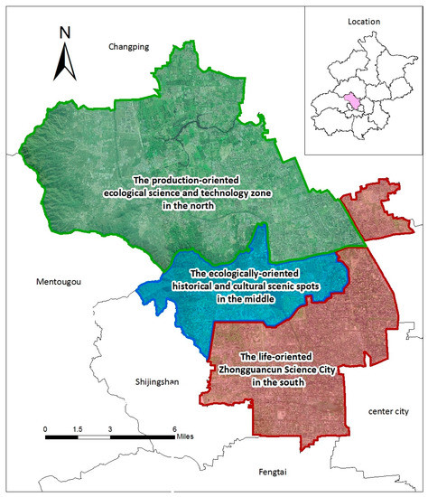 Through a comprehensive consideration of city function orientation, social economic development mode, land use pattern, and other factors in Haidian District, three functional areas for land consolidation were formed in Haidian District by integrating multiple planning objectives (see Figure 5). The production-oriented ecological science and technology zone in the north is positioned as a technological innovation base, a model region of urban-rural overall development, and a new district within a developing city with a leading ecological environment. Three ecologically oriented mountains and five gardens with historical and cultural scenic spots in the middle are positioned as centers of culture, historical relic protection, ancient capital representation, demonstration zones for the integration of science and technology and culture, and top world tourist destinations. The life-oriented Zhongguancun Science City in the south is positioned as a technological innovation and innovative service research area, growth pole region of leading national and regional innovation and development, and ecologically intelligent region of urban-rural integrated development. Moreover, the land consolidation strategy of northern intensification, central optimization, and southern potentiality exploitation has been implemented.
