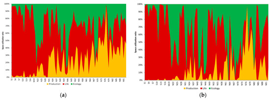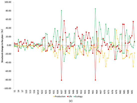 As shown in Figure 7, the horizontal axis represents the evaluation units arranged from south to north, whereas the vertical axis represents the proportion that accounts for the dominant space. Figure 7a shows the spatial-structure’s regional distribution of the current use of valuation units, whereas Figure 7b exhibits spatial-structure’s regional distribution of the planned use of valuation units. Thus, a difference value could be obtained by subtracting the dominant function proportions in Figure 7a,b. As shown in Figure 7c, the production-life-ecology disparities between status quo and planning are represented to reveal functional capacity demands of land consolidation for each evaluation unit. The analysis of spatial change in the current situation and the planning structure of production-life-ecology land utilization showed that life space will exhibit a declining trend in the evaluation units from south to north, whereas the ecological and production space will exhibit an increasing trend. Based on the analysis of the consolidation spatial variation trend, the production space showed an intensive conservation trend and the land use size reduction from south to north gradually increased. Moreover, the ecological space showed an increasing trend that peaked in the range of the natural ecological reserve and reached a high value in the ecological service zone distributed in the regional country park. Furthermore, life space increased in the middle, and the change was apparent in the production land.