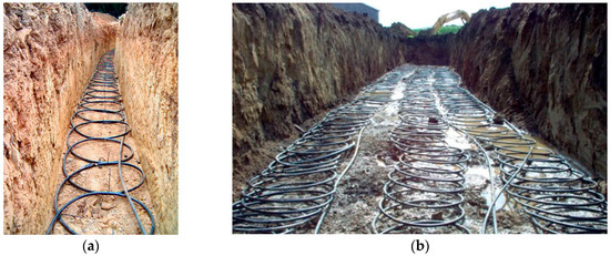 A GCHP system is usually composed of a heat pump and a ground heat exchanger (GHE). The GHE can be horizontally installed in trenches or vertically in boreholes [5]. Vertical GHEs need smaller buried pipe area and can obtain the most efficient system performance. However, the depth of borehole in which vertical GHEs are installed often varies from 40 to 100 m, thus resulting high drilling costs. Horizontal GHEs, consisting of straight or coil pipes that are installed in a trench with a depth of 1.5–2.0 m, can provide a viable alternative solution that obtains a good compromise between high efficiency and low costs. However, conventional straight horizontal GHE requires a large amount of land surface, this limits its application [6]. As an alternative, horizontal slinky coil ground heat exchangers (HSCGHE) (Figure 1) have higher pipe density and need less land area and excavation work than conventional straight horizontal GHE. Because of these advantages, the HSCGHE has been widely concerned for the case that needs high efficiency and low costs [6].