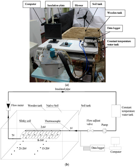 The experimental device, which is a model test system designed based on the similarity theory, was installed in Yangzhou University [29]. As shown in Figure 2, the experimental system includes a soil tank, constant temperature water tank, circulation water pump, flow meter, adjust valves, and data logger system. The water was heated by the electric heaters installed in the water tank and then the heat was discharged into the soil by the slinky-coil GHE. Different inlet water temperature can be set by adjusting the power of the heaters. The flow adjust valve and flow meter were utilized to set and test the flow rate of circulating water, respectively. The temperature data were tested and recorded at a time-interval by a data logger system.