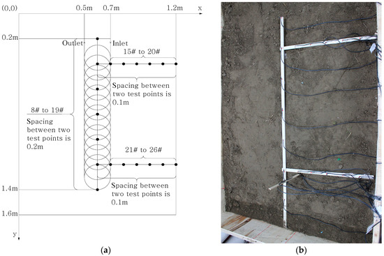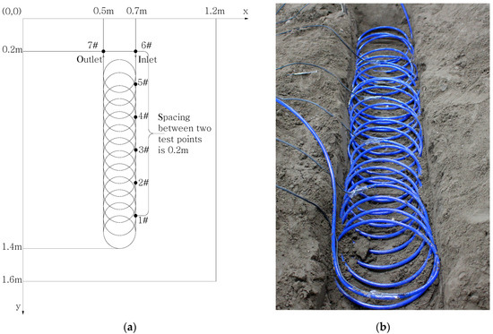As shown in Figure 3, seven thermocouples (named from 1# to 7#) were wrapped on the outer wall of pipe along the coil to measure the fluid temperature variation along the coil. Among them, the inlet and outlet fluid temperature of coil were measured by 6# and 7# thermocouples, respectively. The soil temperature distribution around the coil pipe was monitored by 19 thermocouples (named from 8# to 26#) buried at different locations in the soil (shown in Figure 4). All temperature sensors were made with T-type thermocouples. The Agilent data logger instrument shown in Figure 2 was used to automatically record the values of all temperature test points.