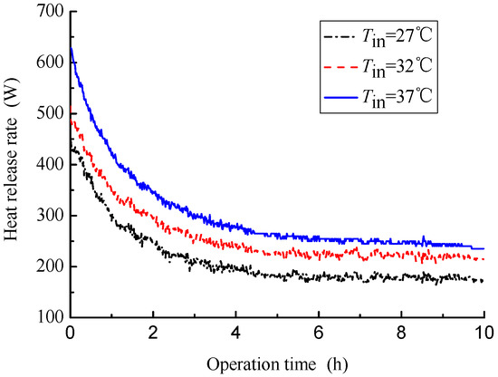 It can be seen in Figure 5 that the heat release rate of the HSCGHE decreases with time and gradually reaches a stable value. The higher the inlet temperature, the larger the stable value of heat release rate. As shown in Figure 5, the corresponding stable value of heat release rate at the inlet temperatures of 37, 32 and 27 °C are, respectively, 300.7, 260.3 and 214.6 W. The increment of heat release rate are 45.7 W and 86.1 W for increasing from 27 to 32 °C and from 27 to 37 °C, respectively. The latter is almost twice the former. Therefore, increasing the inlet temperature can effectively enhance the thermal performance of the HSCGHE.