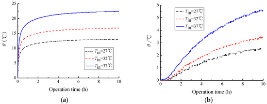 In this paper, water temperatures of 37, 32, and 27 °C, which are usually used in engineering, were chosen to explore the influences of inlet temperatures on thermal characteristics of HSCGHE. The initial ground temperature before the experiment is 11.3 °C, and the experimental results are presented in Figure 5 and Figure 6.
