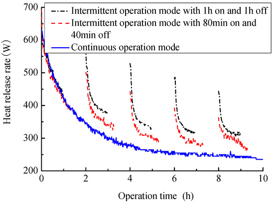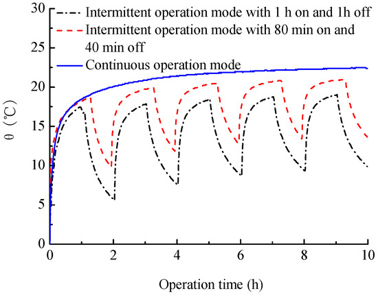 To explore the influences of intermittent operation modes, three operation modes were used in this experiment, which include continuous operating mode, intermittent operating mode with 80 min on and 40 min off, and intermittent operating mode with 1 h on and 1 h off. During the experiment, the inlet water temperature and test time are set to 37 °C and 10 h, respectively. The test results are presented in Figure 7 and Figure 8.