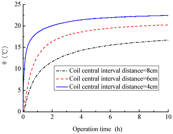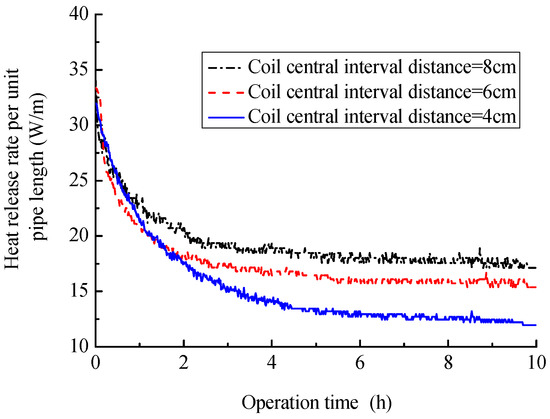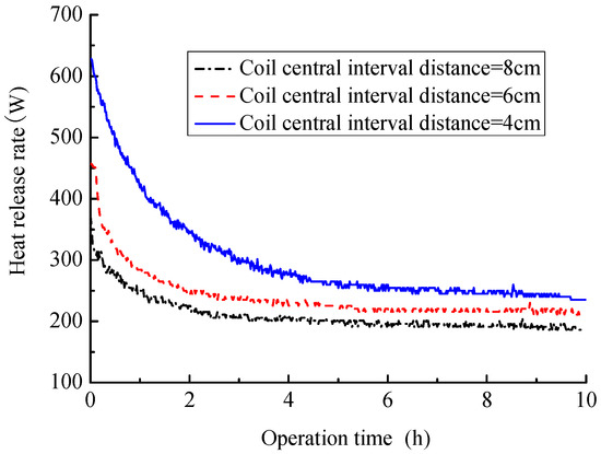 Figure 9 shows that a smaller coil central interval distance can contribute to a larger heat release rate. As shown in Figure 9, the heat release rate at the time of 10 h are, respectively, 186.2, 210.7 and 235.2 W for the coil central interval distance of 8, 6 and 4 cm. The main reason is that the coil length and corresponding heat exchange area increase as the coil central interval distance decreases, which help to enhance the heat transfer between the coil and soil around it. In Figure 10, we can further find that the heat release rate per unit length of coil will become small due to the decrease of coil central interval distance. For instance, when the coil central interval distance is 8 cm, the heat release rate per unit length of coil are 19.3 W/m, and the corresponding value is 15.3 W/m for 4 cm, 20.7% decrease compared with coil central interval distance of 8 cm. This means that the coil central interval distance cannot be too small and should be determined by considering the heat release rate, coil costs and available buried coil area.