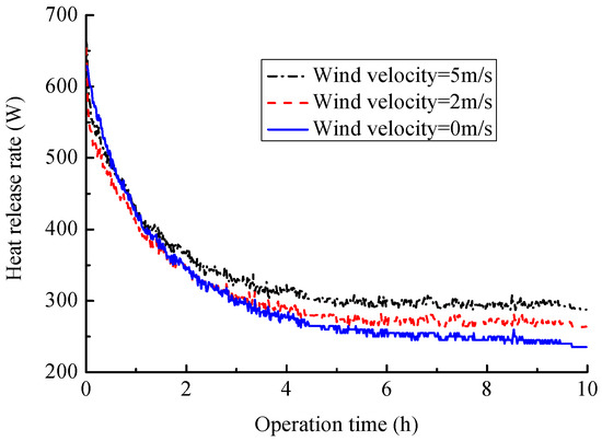 It can be seen in Figure 12 that the heat release rate increases as the surface wind velocity grows. As shown in Figure 12, the average heat release rate is 300.7 W for the wind velocity of 0 m/s, and the corresponding values are 311 and 334.2 W, respectively for the ground surface wind velocities of 2 and 5 m/s. Compared with 0 wind velocity, the heat release rate under wind velocities of 2 and 5 m/s increase, respectively, by 3.4% and 11.4%. The main reason is that a large surface velocity can enhance the convection heat transfer in the ground surface. Therefore, increasing wind velocity help to improve the heat release performance of HSCGHE.