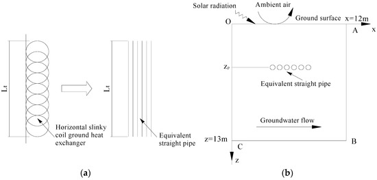 The physical model of horizontal slinky coil ground heat exchanger: (a) equivalent straight pipe with same spacing; and (b) computation region for equivalent straight pipe.