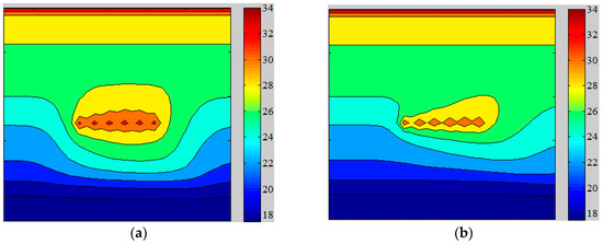 Soil temperature distribution after 45 days operation for different groundwater advection velocity: (a) u = 50 m/year; and (b) u = 300 m/year.
